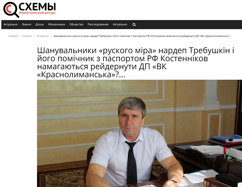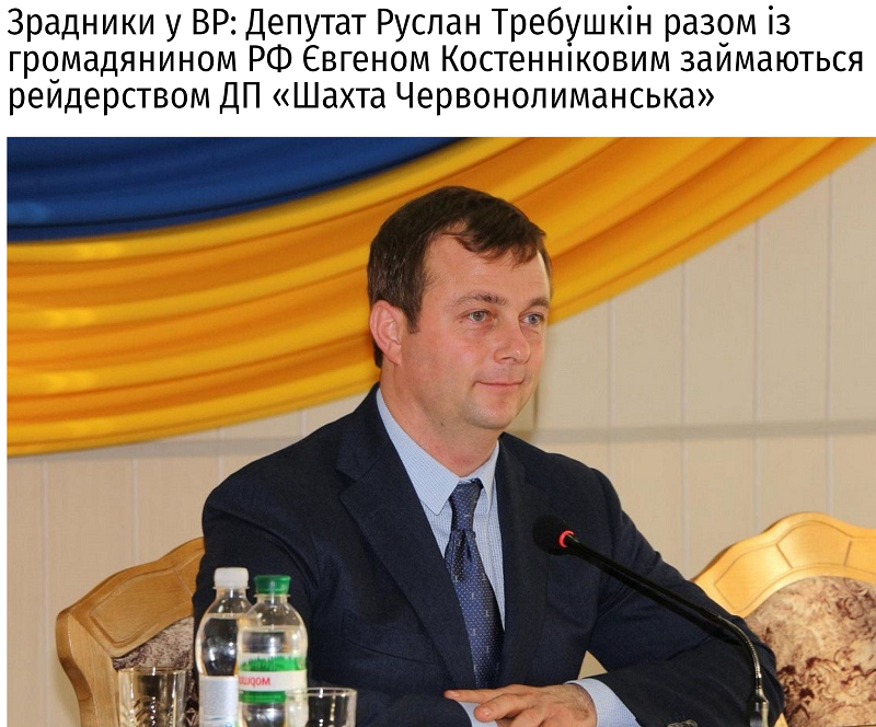 Вже доволі тривалий час ми тримаємо руку на пульсі щодо, м’яко кажучи перепитій, довкола ДП «Вугільна компанія «Краснолиманська», а точніше – як дане підприємство намагаються рейдерськими методами захопити! А намагається це зробити, маскуючи під допомогу – народний депутат Руслан Требушкін за допомогою свого помічника (як народного депутата) із паспортом російського агресора – Євгена Костеннікова. До речі, останній особисто сам констатував, що люб’язно прийняв паспорт РФ бо не бажає сплачувати у Криму податок як закордонний громадянин…