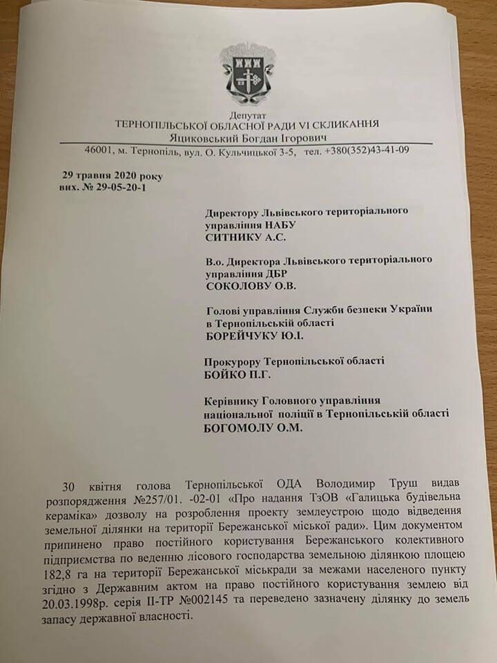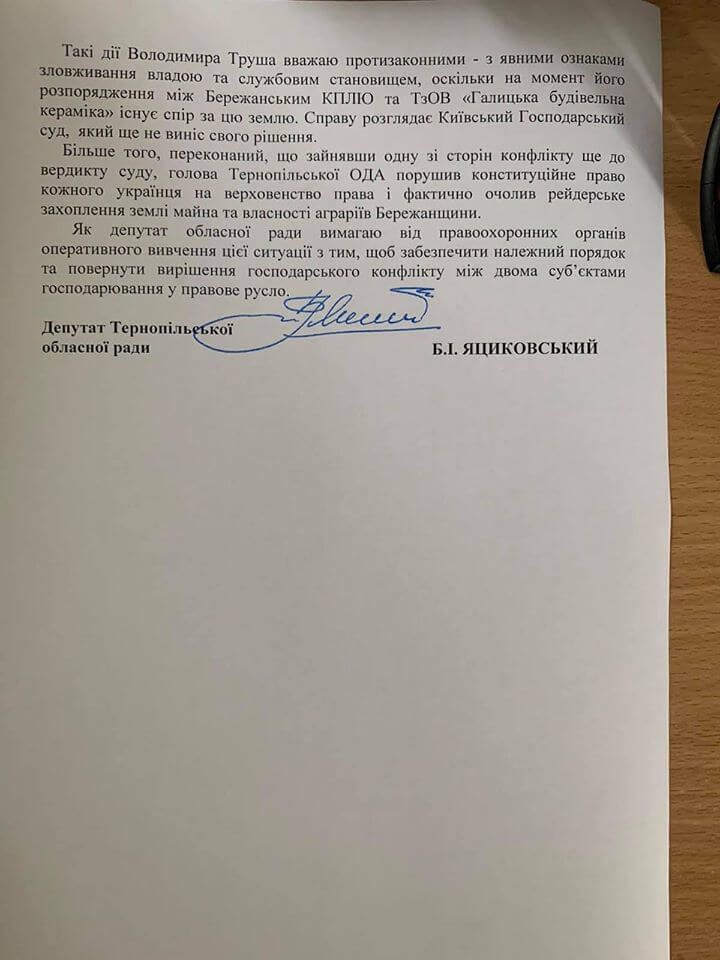 “Однак, незважаючи на конституційний принцип верховенства права, 30 квітня Володимир Труш без рішення суду видав розпорядження №257/01.-02-01. Згідно з ним голова ОДА одноосібно (!!!) позбавив права користування землею Бережанське колективне господарство та дозволив «Галицькій будівельній кераміці» розроблення проекту землеустрою щодо її відведення.