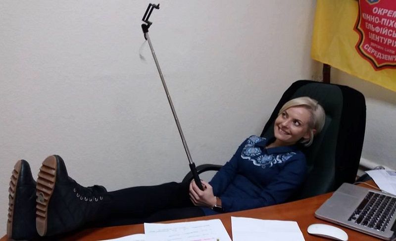 Екс-керівник військового телерадіо і «музикознавець» Яна Холодна у своїй улюбленій позі в колишньому службовому кабінеті.