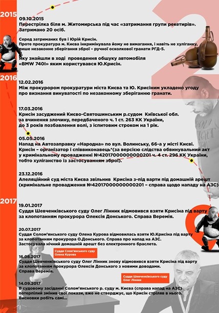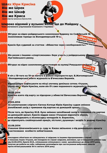 Вот только некоторые факты из его “трудовой” биографии. В 2009 году Крысин фигурировал на видео рейдерского захвата дома по ул. Софиевской, 18, захватывал чердак на Владимирской 19-а. В 2010 году был осужден по статье Убийство по неосторожности. В 2012 году вместе с другими “спортсменами” принимал участие в рейдерском захвате Лукьяновского рынка. В 2013 году фигурировал на видео захвата автозаправочной станции на ул. Ревуцкого в Киеве.