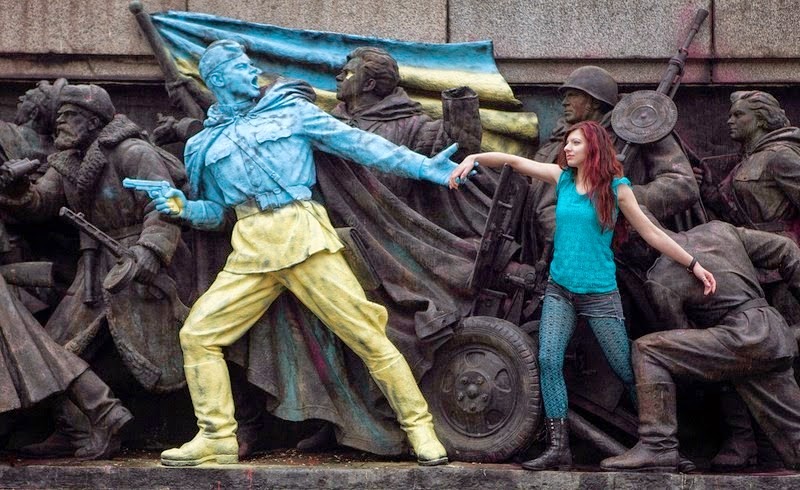 А год спустя, в разгар Революции достоинства в Украине, одна из фигур приобрела цвета украинского флага.