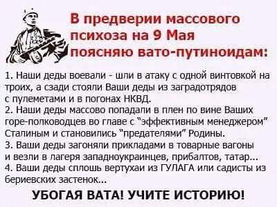 Никто из вас не видел ту войну. Никто из вас не выигрывал ту войну. Сколько вы не наряжайте своих детей в пилотки и красноармейскую форму, сколько не маршируйте, сколько салютов не запускайте и лентами не подвязывайтесь, но ближе к той войне вы не становитесь. Только кощунствуете, глумитесь, опошляете, пляшете на костях, спекулируете на памяти, романтизируете оторванные конечности и разбросанные по окопам кишки ваших дедов.