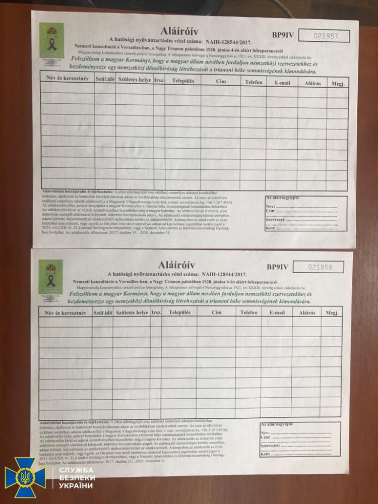 У межах кримінального провадження, розпочатого слідчими органів безпеки за ч. 2 ст.110 КК України, задокументовано факт використання представниками іноземних організацій громадянина нашої держави для збору підписів мешканців області на підтримку петиції щодо скасування умов Тріанонського мирного договору.