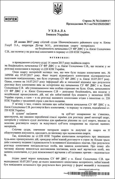 – 25.07.2017 року, Ухвалою за № 761/24809/17 слідчого судді Шевченківського районного суду м.Києва було зобов’язано начальника СУ ФР ГУ ДФС у м.Києві Солодченка С.В. розглянути клопотання особи 1 від 07.07.2017 року в за вих. № 1499/06;