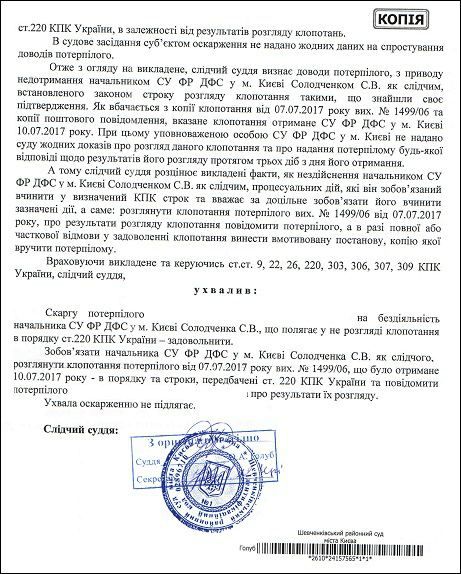 – 18.07.2017 року, Ухвалою за № 761/24811/17 слідчого судді Шевченківського районного суду м.Києва було зобов’язано начальника СУ ФР ГУ ДФС у м.Києві Солодченка Сергія Вікторовича розглянути клопотання особи 1 від 07.07.2017 року в за вих. № 1498/06;