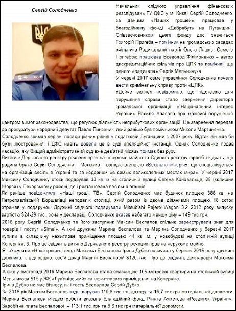 Крім того, як для даного випадку, позиція Солодченка С.В. є явно злочинною та антидержавною, що направлена на підрив довіри громадськості до органів державної фіскальної служби і керівників держави в цілому, що явно наруку зовнішнім ворогам.