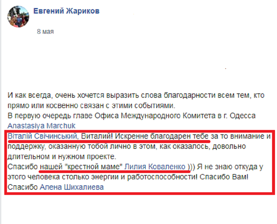 Но кто же из «зеленых чиновников» сунул свой клюв в разворовывание благотворительных средств предназначенных для борьбы с COVID-19 в Одесской области? При этом выступив в «прикрытии» преступной деятельности Одесского Общества Красного Креста. Сам Жариков Евгений «излизывается» в любезности своей коррупционной властной «крыше» которая помогает ему преступно зарабатывать. Согласно распоряжению губернатора Одесской области «крыша» Одесского Красного Креста ещё входит и в штаб по ликвидации COVID-19 в Одесской области.