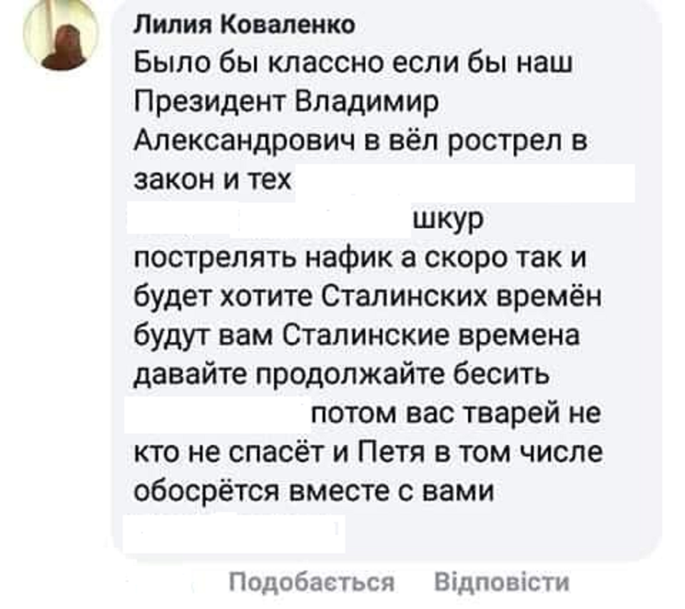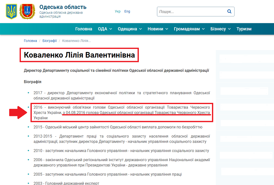 Сама Коваленко Лилия темная лошадка и заслуживает отдельного разбора ее личности. До недавнего прошлого оказывается что Коваленко Лилия была тоже руководителем Одесского коррупционного офиса Общества Красного Креста, но очевидно что объемы по дерибану в Красном Кресте для нее были меньше и недолго думая Коваленко Лилия перебирается в кресло директора Департамента, ведь дерибанить бюджетные деньги удобнее под куполом власти, а ещё и в «зеленой бригаде». Под прикрытием «зеленой бригады» Коваленко Лилия не только потеряла страх занимаясь воровством, дерибаном и «крышиванием» но и любит «пострелять» по гражданам просящих помощи среди которых есть дети сироты, инвалиды, пенсионеры, участники АТО при этом нелестно выражаясь о прежних главах государства в котором она «работает».